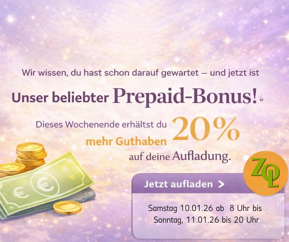 🎉 Dieses Wochenende bekommst du wieder 20 % mehr Guthaben auf deine Aufladung. |